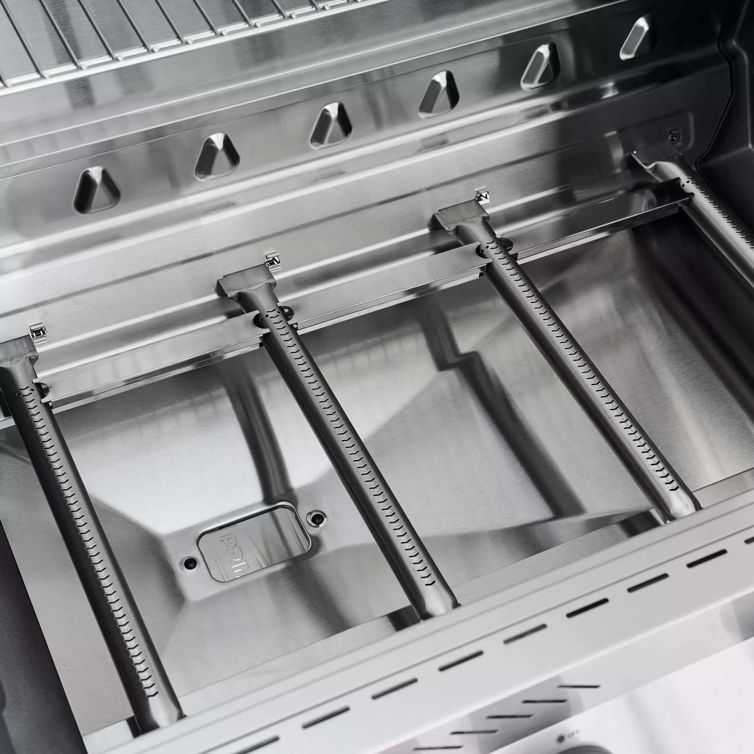 Мощные запатентованные турбогорелки BLADE™ разгоняют гриль до 300 градусов за 10 минут. В левом пристолье установлена боковая инфракрасная горелка BROIL ZONE™. Как и у всех топовых грилей, основная решетка выполнена из нержавеющей стали толщиной 8 мм.