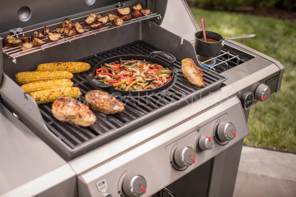 Благодаря встроенным функциям и дополнительным аксессуарам в газовом гриле Weber Genesis II EP-335 можно жарить на разных типах решеток, готовить мелкие морепродукты и мягкие овощи, делать пиццу и выпечку, ставить кастрюли и сковородки, устанавливать вертел и даже добавлять к нему шампуры.