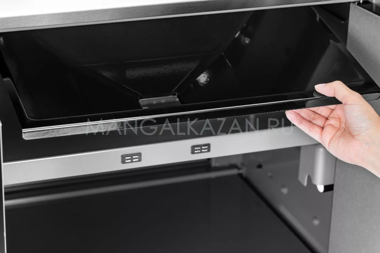 - Просторный шкаф в корпусе гриля оснащен стальными дверцами для удобства хранения принадлежностей.