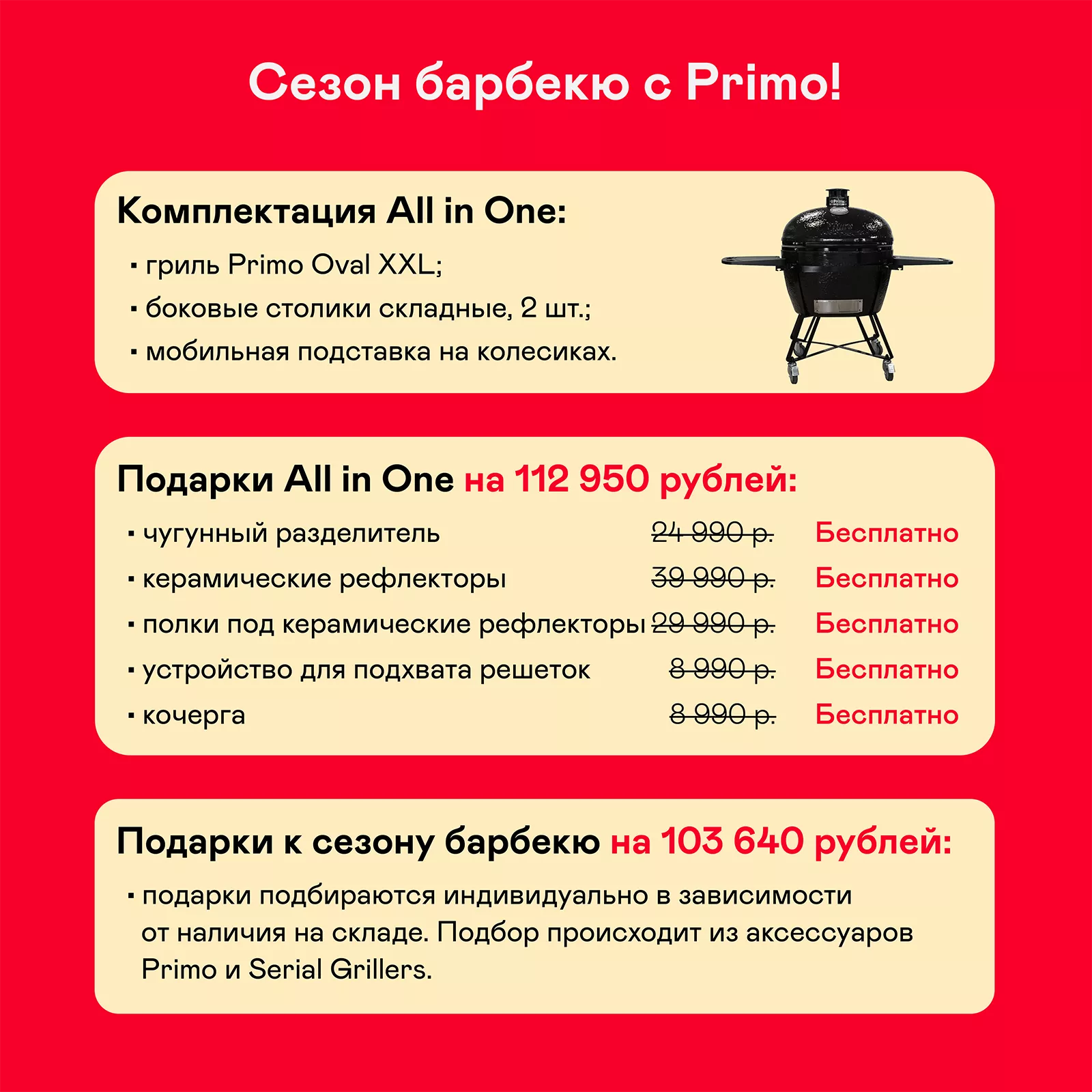 В комплектации All in One гриль Primo является полноценной зоной барбекю. Подробнее смотрите во вкладке «Комплектация».