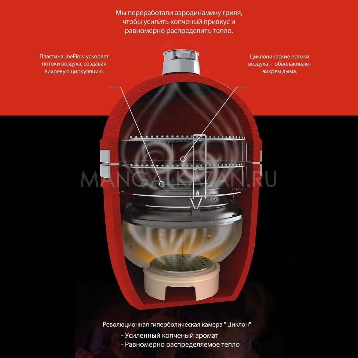 Система «Циклон» переворачивает представление о готовке в керамическом гриле - горячий воздух закручивается в много небольших завитков вместо классической конвекции. «Циклон» максимально эффективен при приготовлении длинных рецептов и копчении. Благодаря использованию этой системы блюдо прогревается максимально равномерно, а перепад температуры по поверхности решетки составляет не более 3 градусов.