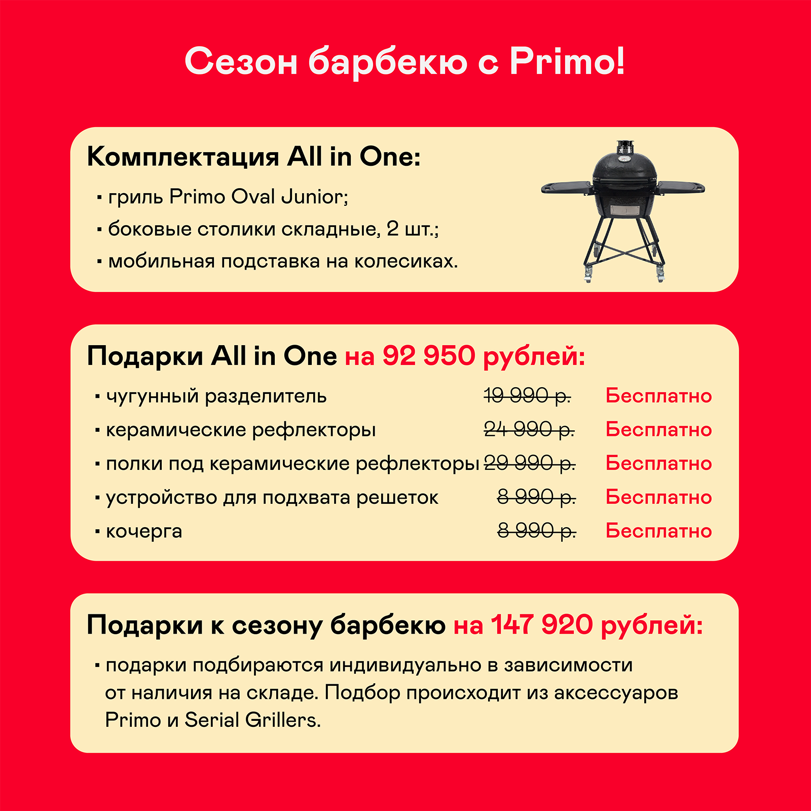 В комплектации All in One гриль Primo является полноценной зоной барбекю. Подробнее смотрите во вкладке «Комплектация».