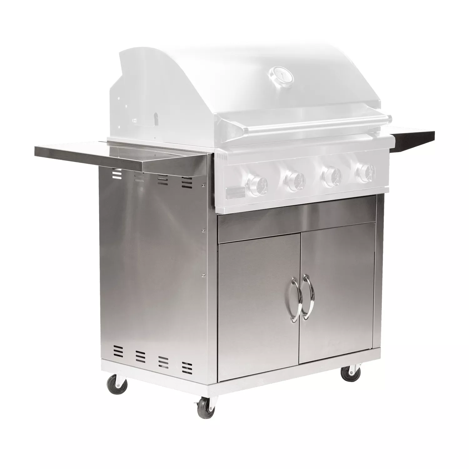 Стол-тележка из нержавеющей стали для газового гриля Broilmaster Element 3. Надежная конструкция, удобные столики, колеса со стопорами и ящик для хранения.