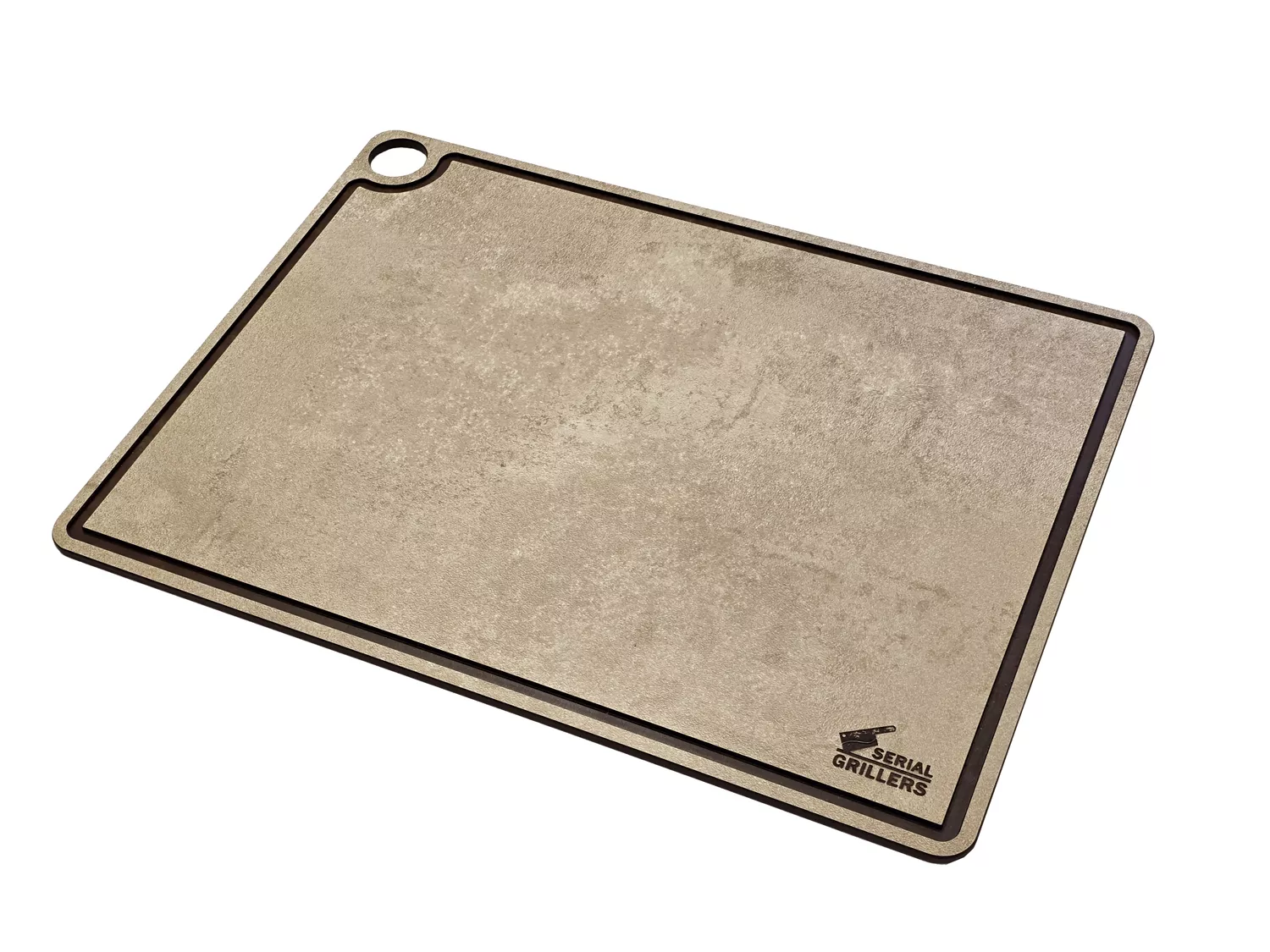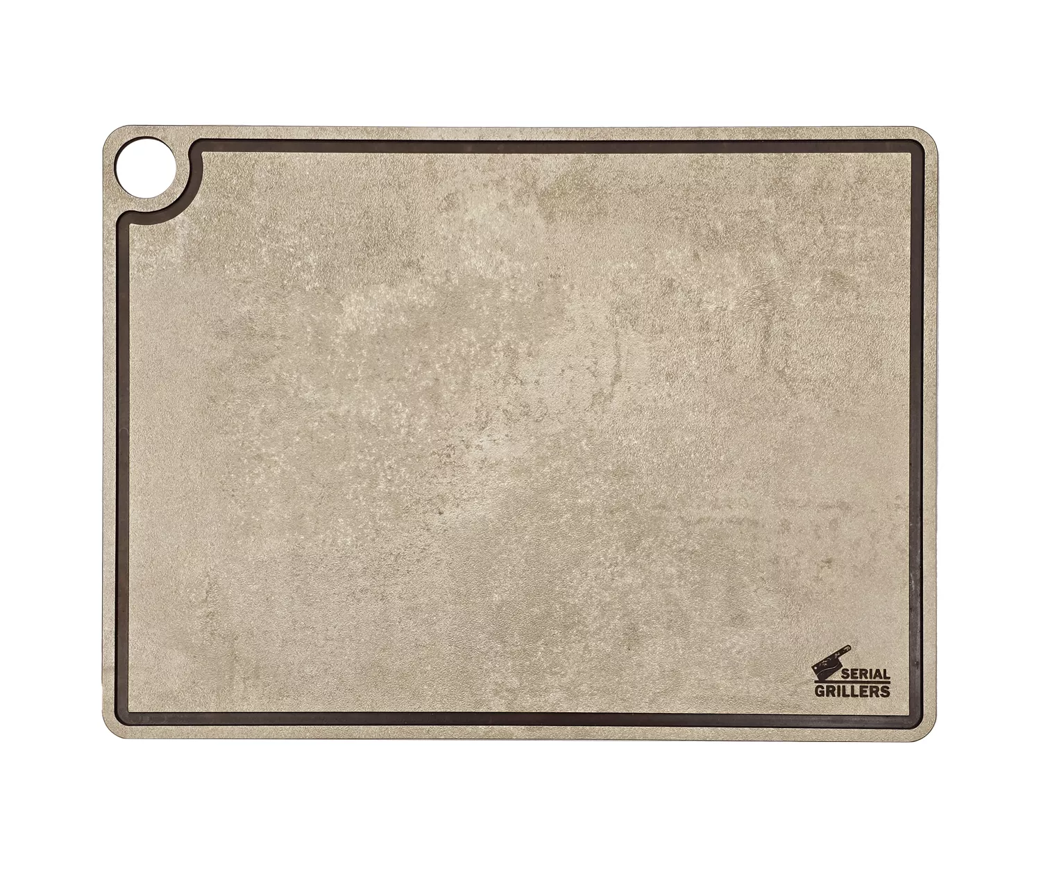 Композитная разделочная доска от Serial Grillers прочная, не тупит ножи и её можно мыть в посудомоечной машине (деликатный режим до 45 °C). Специальный желоб по периметру улавливает мясные соки и не дает им стекать на стол.