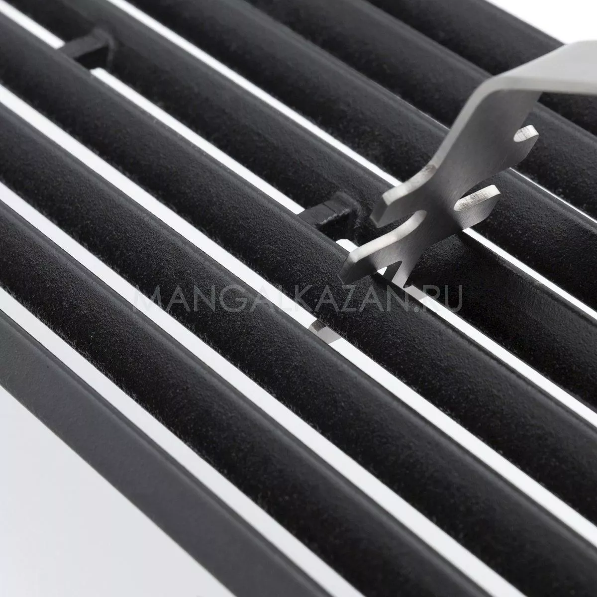 Новая улучшенная лопатка Broil King для подъема решеток. Одна конфигурация зубьев для чугунных решеток, вторая – для решеток из нержавеющей стали. Лопатка сделана из нержавеющей стали и имеет резиновую ручку.