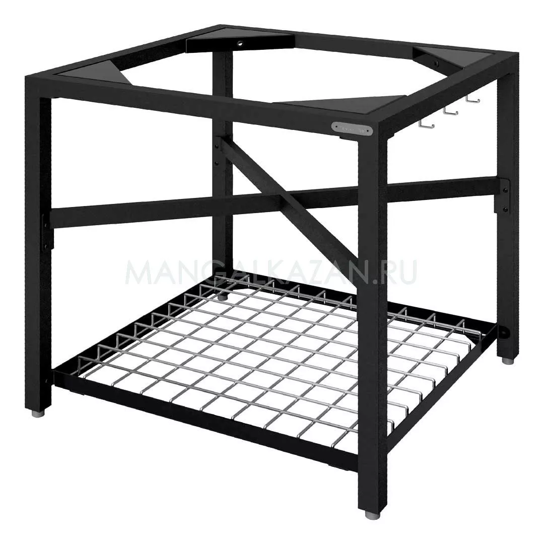 Надежный стол для гриля Big Green Egg. В комплекте идут крючки для инструментов, железная решетка-полка внизу и регулируемые ножки, которые можно заменить на докупаемые колесики. Также вы можете приобрести второй столик с полками.