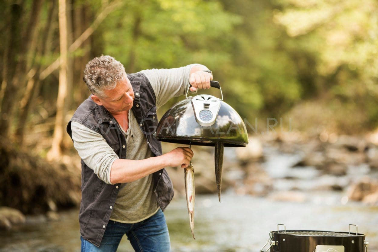 - В верхней крышке имеется горизонтальная перекладина с пятью крючками для крепления мяса, рыбы, ребрышек или сосисок